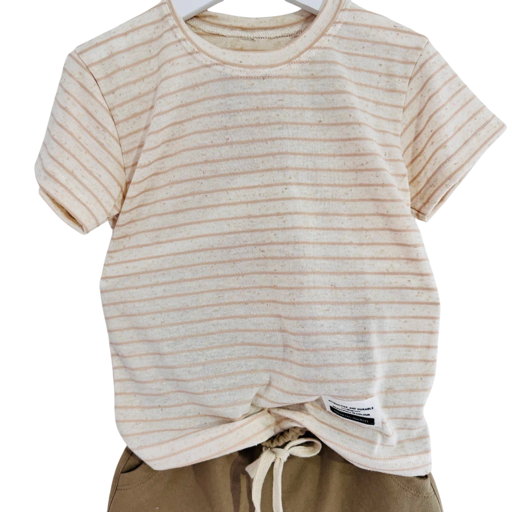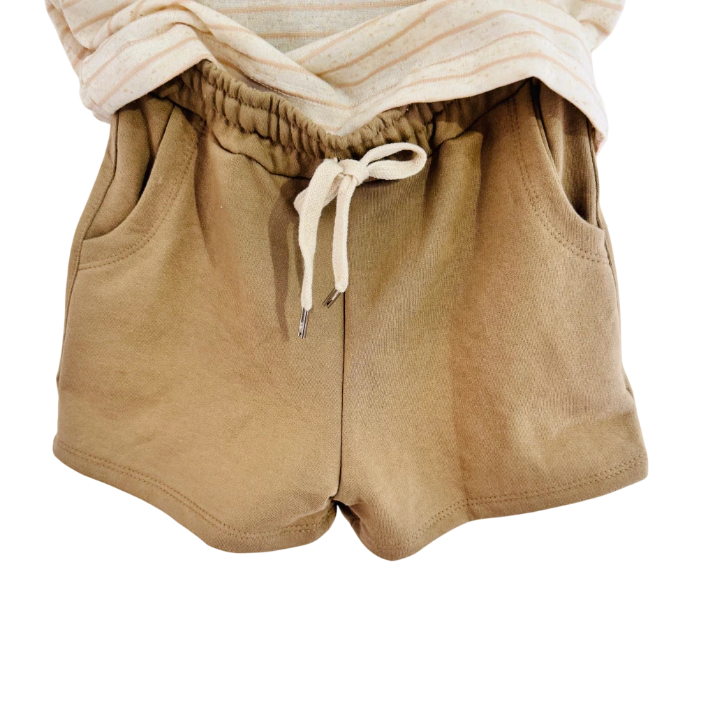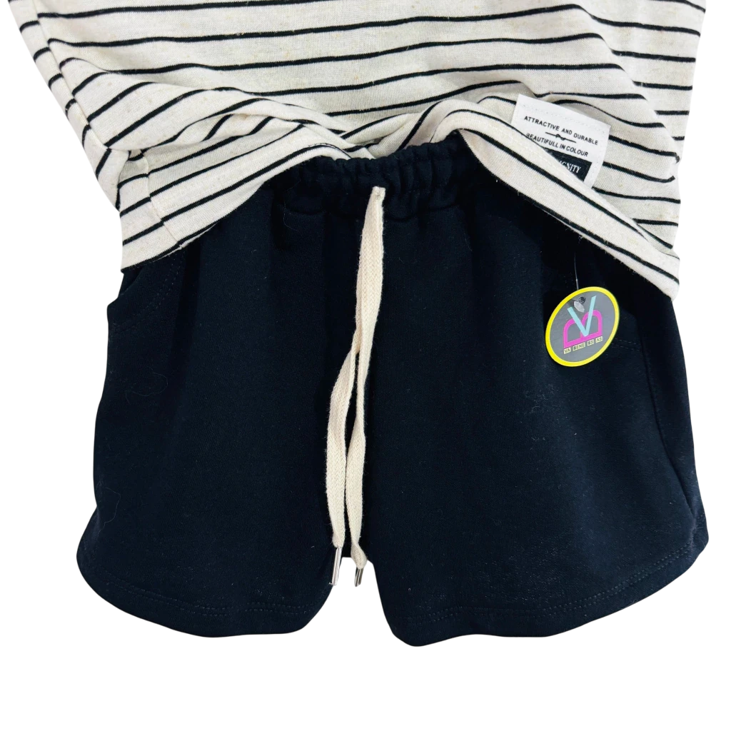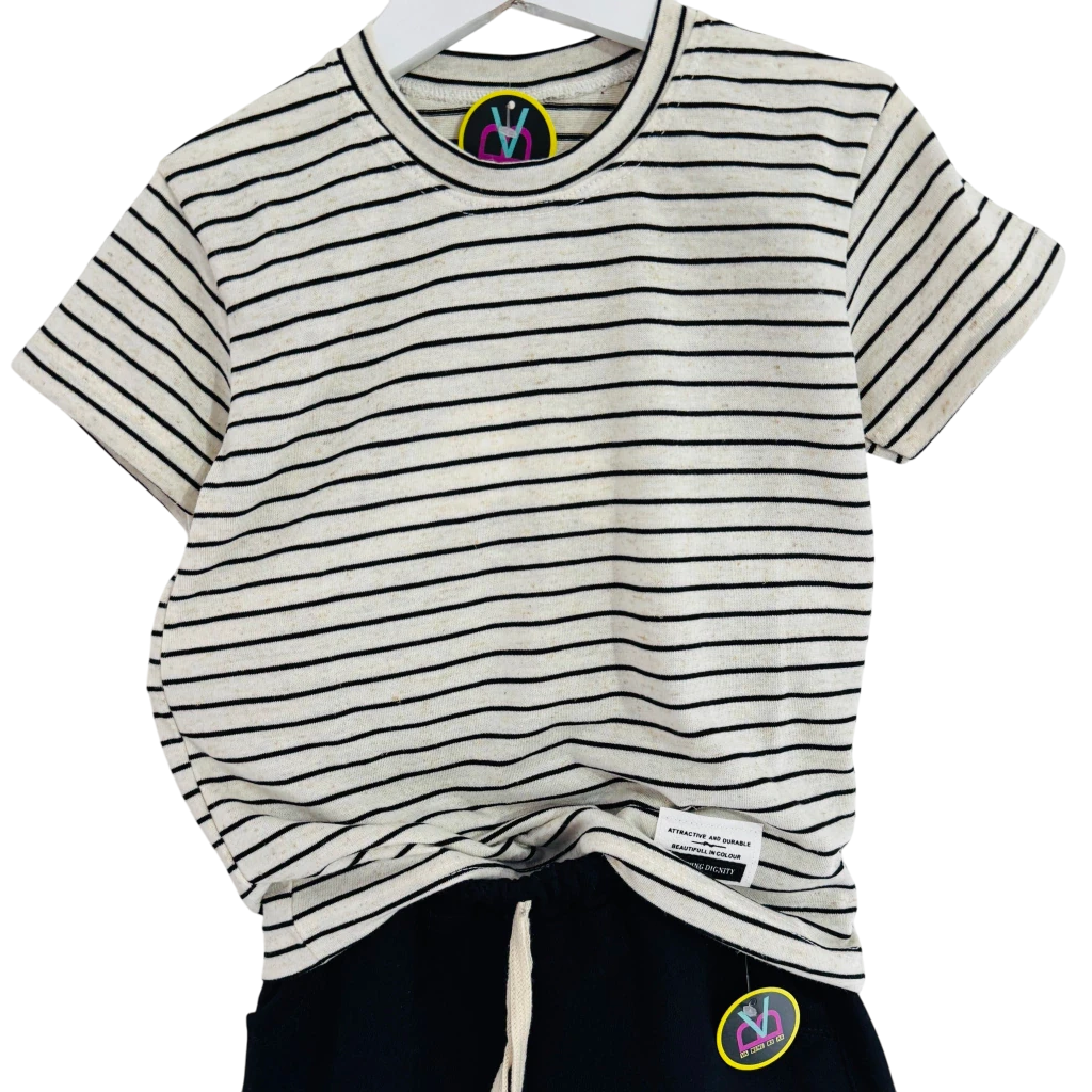 Conjunto compuesto de remeras de lino y algodón rayada más Bermuda lisa con bolsillos delanteros cordón regulable y elástico en la cintura
